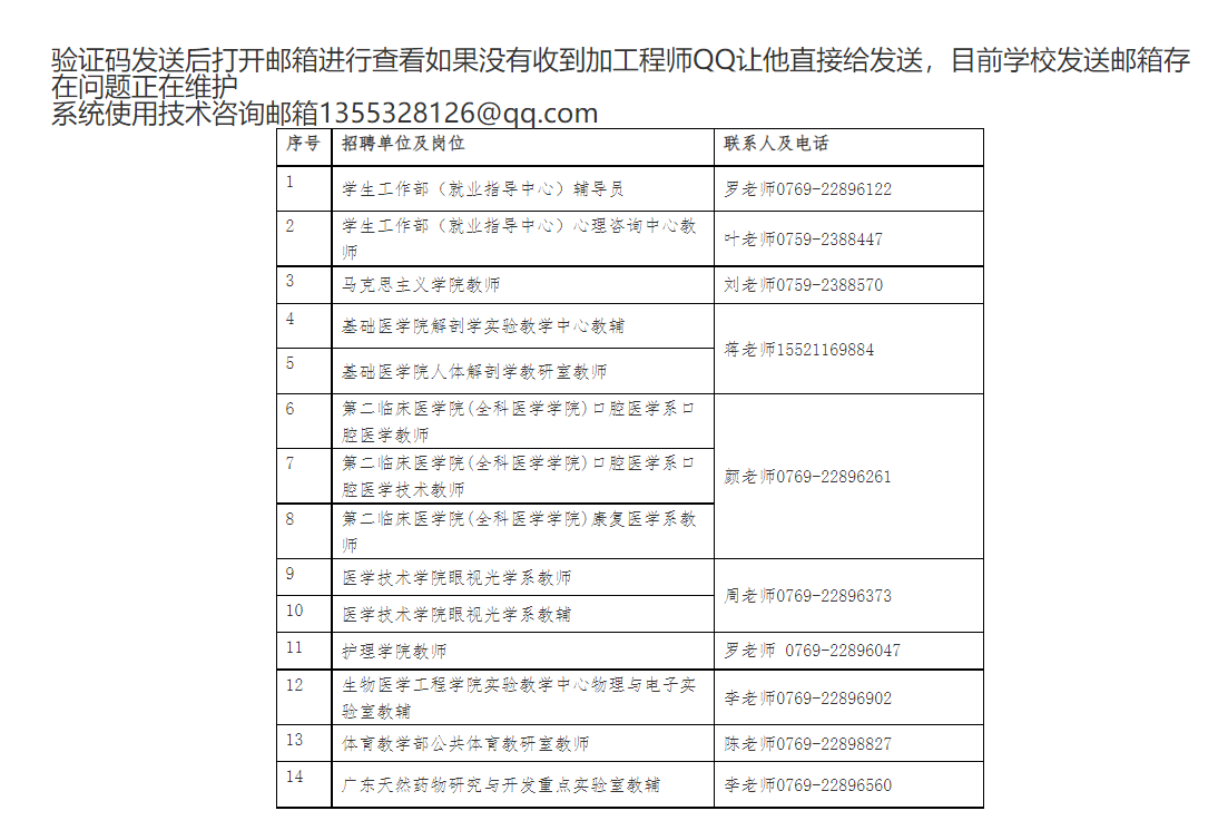 系统咨询:报名系统使用问题请通过招聘系统http://zp.gdmu.edu.cn/“技术咨询”入口进行咨询,各岗位联系方式详见系统“联系我们”。