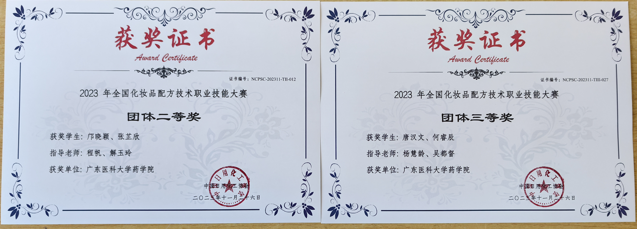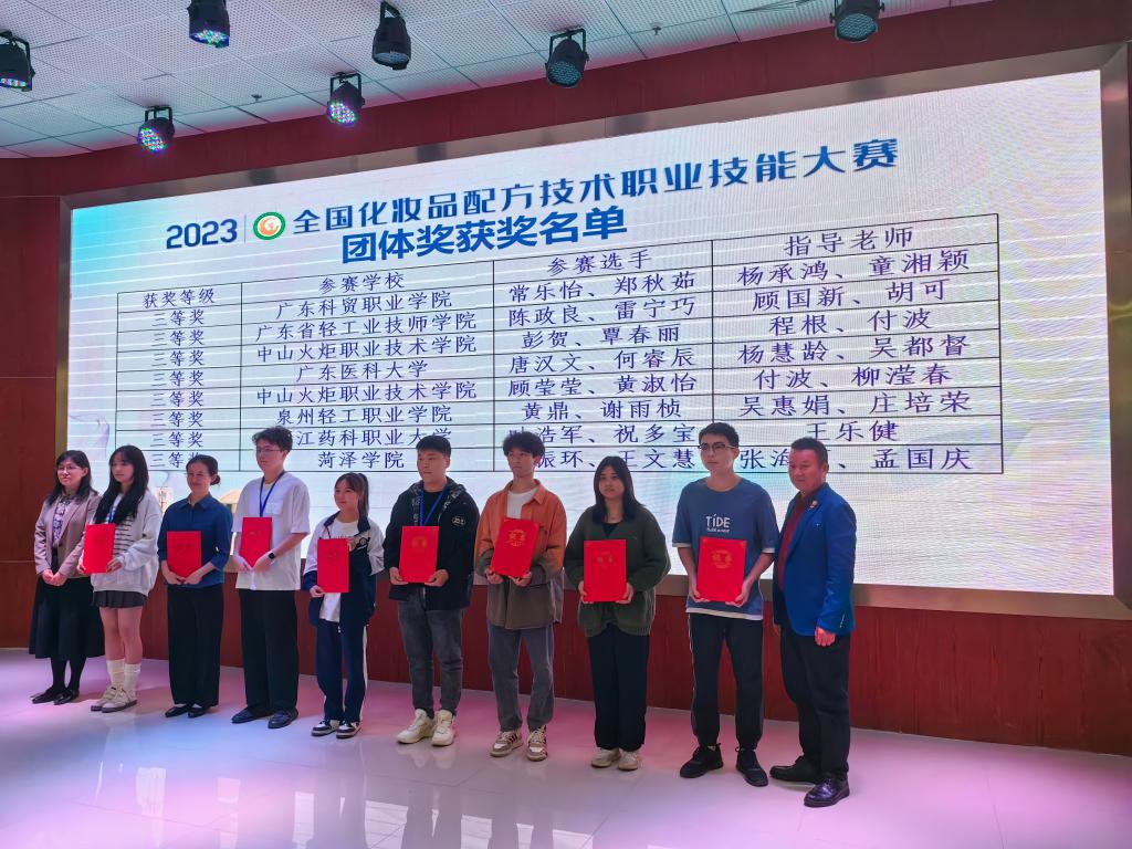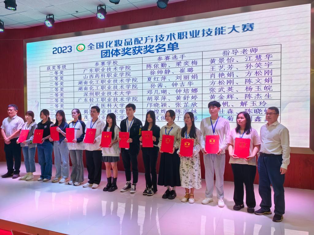 11月24日,由全国轻工职业教育教学指导委员会指导、全国轻工职业教育教学指导委员会日用化工专业委员会支持、中国日用化工协会主办、广东轻工职业技术学院承办的2023年全国化妆品配方技术职业技能大赛决赛在广东轻工职业技术学院南海校区举行。新葡萄药学院首次参加该项比赛,比赛中新葡萄学子沉着冷静,熟练操作,充分展示了广东医人的拼搏精神,经过层层选拔和激烈角逐,最终新葡萄共获得团体二等奖1项、三等奖1项,个人二等奖2项、三等奖2项的好成绩,参赛选手均获得由中国轻工业联合会颁发化妆品配方师(三级)职业能力评价证书。