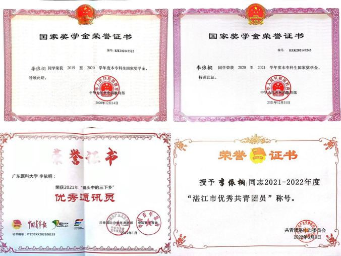 李依桐是妥妥的学霸,所学全部课程中,学年均分最高91.54分,获得校长奖学金2次、学业/综测一等奖4次、国家奖学金4次。在紧张的学业之余,李依桐积极地参与各级各类的学科竞赛,获得全国学术英语词汇竞赛三等奖、广东省联盟杯英语写作大赛校级二等奖、医学模型设计大赛三等奖及最佳人气奖(队长)。
