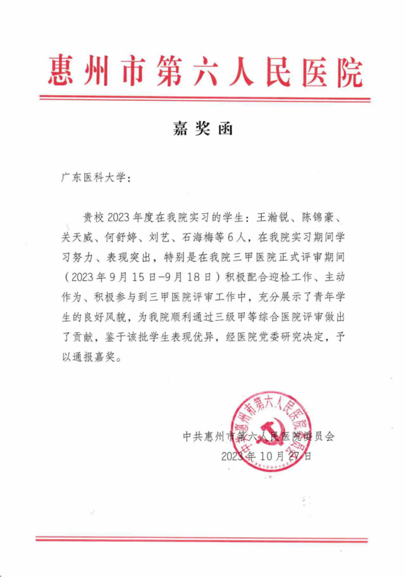 实习期间,他担任实习小组组长,积极协助实习单位完成迎检工作,表现突出,获得实习单位书面嘉奖。同时,注重理论与实践相结合,在惠州市第六人民医院第二届临床技能竞赛(实习生组)中荣获三等奖,体现了扎实的专业技能和临床实践能力。