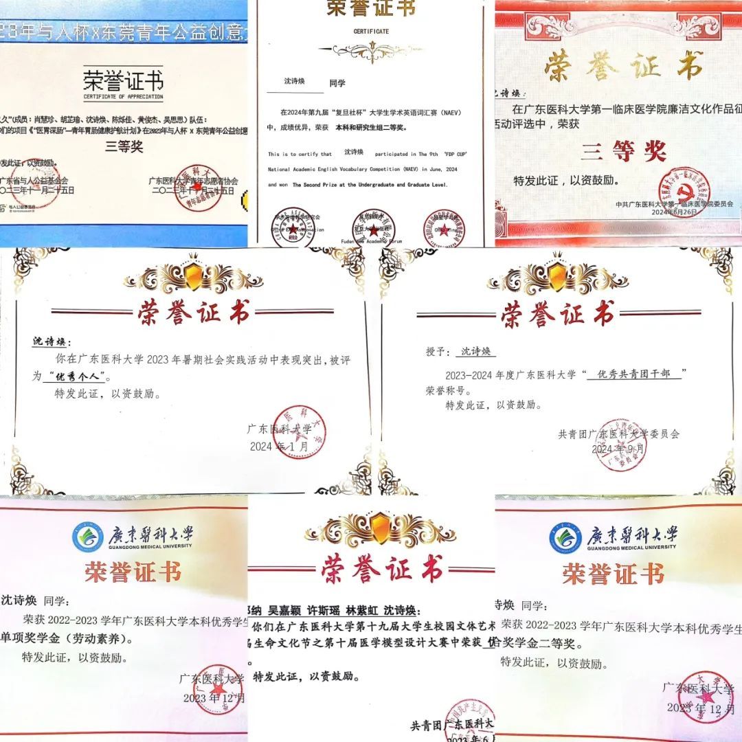 在专业学习中,沈诗焕有明确的学习目标,勤奋好学,态度端正,较好地掌握专业知识,连续两年学业排名位居专业前3%,2023-2024学年综测成绩专业前1%,荣获综合奖学金及单项奖学金。