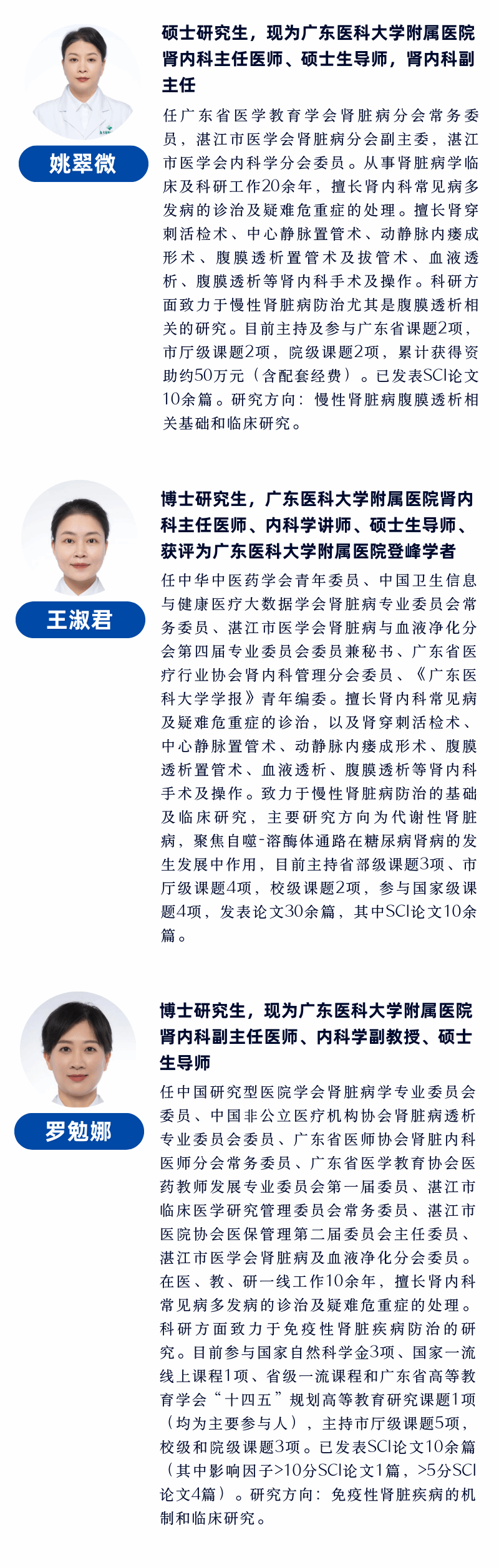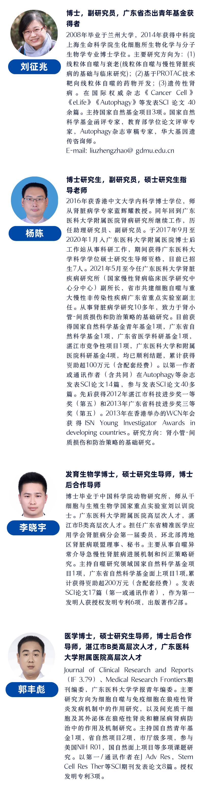 团队依托基础和临床两大平台。其中基础研究方向依托省市共建细胞自噬与重大慢性非传染性疾病研究广东省重点实验室;临床方向所依托的肾病科获评国家临床重点专科建设单位和国家中西医协同 “旗舰” 科室,并牵头在粤西地区建成市-县-镇三级联动的尿毒症防控网络,显著提升该区域 CKD 防治水平。