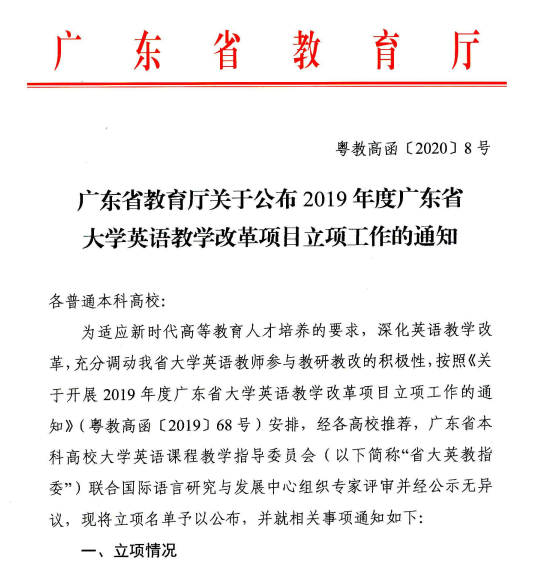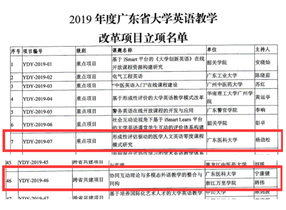 近日,广东省教育厅公布2019年度广东省大学英语教学改革立项项目,新葡萄外国语学院获批两个项目,位居前列。其中新葡萄杨劲松教授主持的《形成性评估驱动的医学人文英语零度课程模式研究》获得重点项目立项,宁康健老师主持的《协同互动理论与多模态外语教学的整合与同构》获跨省项目。两个项目都是基于疫情期间线上课程经验总结的结果基础之上对疫情后线上加线下混合式教学模式进行的深入探讨。