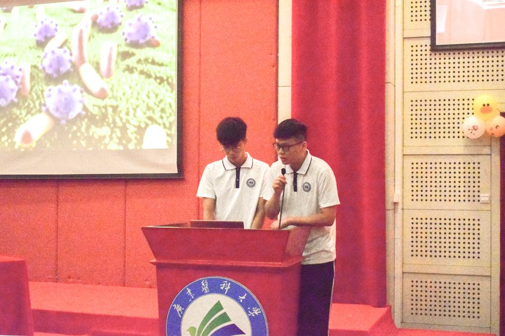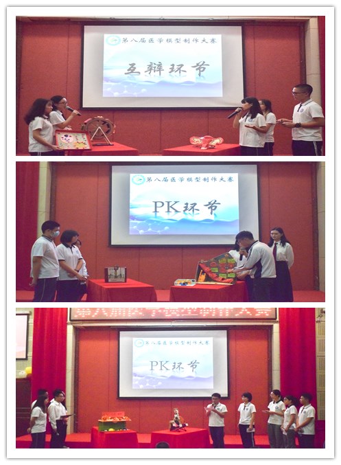 紧接着,是比赛的高潮——紧张激烈的“PK”环节,十支队伍按顺序两两对决。队伍间有针锋相对,火药味浓厚的,亦有礼貌中步步紧逼,不失风度的对决。第一组对决的2号队伍(模型名为“肿瘤哪里逃”)直接指出1号队伍(模型名为“有'痔'无恐”)对自身作品的原理不甚了解以及其作品展示简陋的问题,1号队伍也给予了反驳:“模型作用在于普及,模型虽陋,但我方讲解详细也是一大优点”。第一组的精彩互辩也为后来各组的展示开启了良好的开端,后续的答辩环节中各组各有千秋,激动人心。
