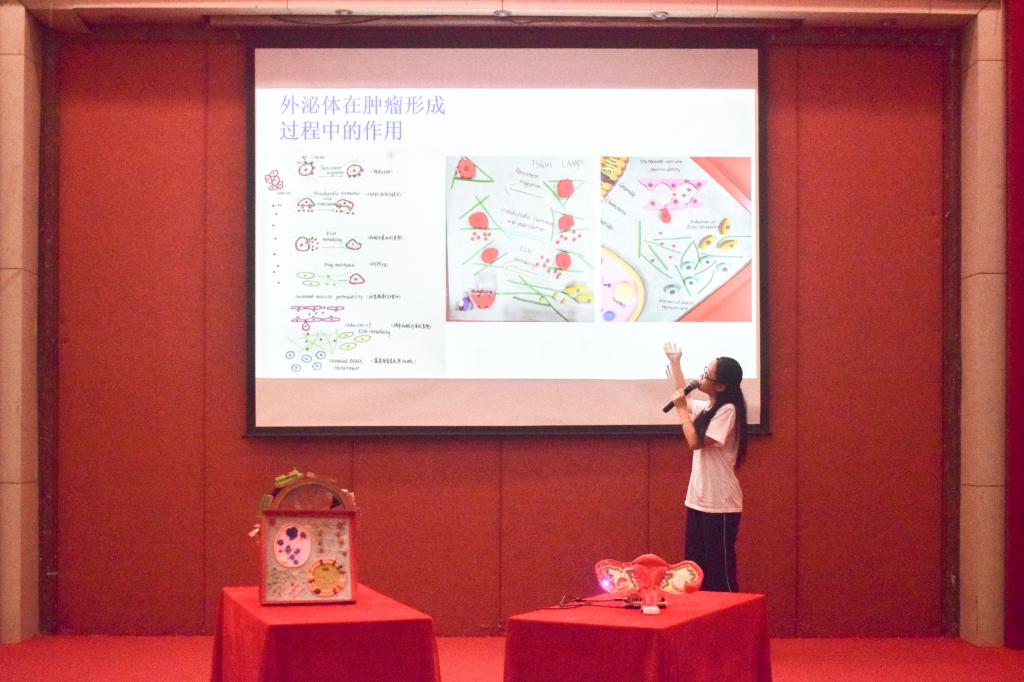 十支队伍披荆斩棘,从百支队伍中脱颖而出,站在决赛的舞台给同学们带来精彩的展示。ppt、小品、小视频、,故事改编等多样的形式及选手或幽默风趣,或严肃认真的风格给在场在场观众带来了一场视觉盛宴。其中,制作7号作品(模型名为“医学僧的肺腑之言”)的同学结合精巧的模型以小品的形式呈现作品的内涵,让人耳目一新。四号队伍(模型名为“公开的'泌'密,外泌体”)展示中的小视频更是紧跟时代的潮流,将肿瘤细胞比拟为海王,生动地描述了肿瘤细胞“勾引”普通细胞转化的过程,给在场的观众留下了深刻的印象。十支队伍的作品制作精美、各具特色,讲解者也自信满满。这些模型不仅给在场的观众带来了视觉上冲击,还促进了知识的科普。