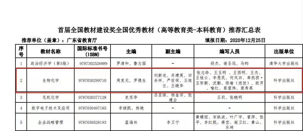 根据广东省教育厅2020年12月28日网站公示通知,新葡萄周克元教授主编、刘新光教授副主编的教材《生物化学》获得省厅推荐参加首届全国优秀教材评选,相关申报材料已通过申报系统报送,并寄送到省教育厅统一报送至教育部参评。