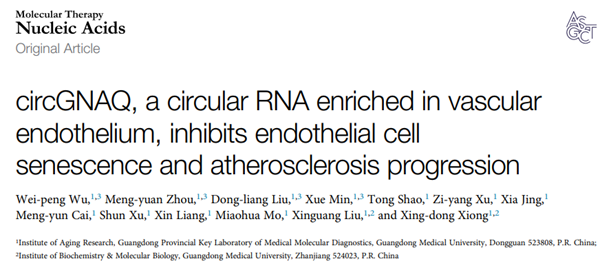 近日,新葡萄衰老研究所熊兴东教授团队以新葡萄8883官网为唯一通讯单位在国际知名学术期刊Molecular Therapy-Nucleic Acids(中科院二区,IF=8.889)上发表了最新研究成果"circGNAQ, a circular RNA enriched in vascular endothelium, inhibits endothelial cell senescence and atherosclerosis progression"。该研究首次揭示了环状RNA circGNAQ通过circGNAQ/miR-146a-5p/PLK2信号通路调控血管内皮细胞衰老,延缓动脉粥样硬化的发生。