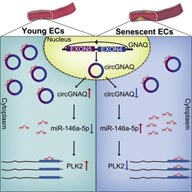 动脉粥样硬化、冠心病等心血管疾病已成为威胁我国公众健康的重要疾病。血管衰老是这些心血管疾病的主要危险因素。而血管内皮细胞衰老是血管衰老的基础,延缓血管内皮细胞衰老可有效预防和减少这些心血管疾病的发生。环状RNA(circular RNA, circRNA)是一类具有闭合环状结构的内源性RNA分子,主要由前体RNA(pre-mRNA)通过可变剪切加工产生。它广泛存在于各种细胞中,具有表达丰度高、结构稳定和组织特异性表达等特征。本研究利用高通量测序技术筛选出在血管内皮细胞衰老过程中差异表达的circRNAs,通过体外实验证实其中circGNAQ可以吸附miR-146a-5p,阻断miR-146a-5p对其下游靶基因PLK2的抑制作用,进而延缓血管内皮细胞的衰老。同时,体内实验发现circGNAQ在血管内皮中特异性高表达,且其表达随着动脉粥样硬化进程持续下调;在AS模型小鼠的血管内皮细胞中特异过表达circGNAQ可以明显延缓血管衰老和减少动脉粥样硬化的发生。本研究揭示了circGNAQ调控血管内皮细胞衰老的作用机制,为延缓血管衰老、预防和治疗动脉粥样硬化提供新的思路和治疗策略。