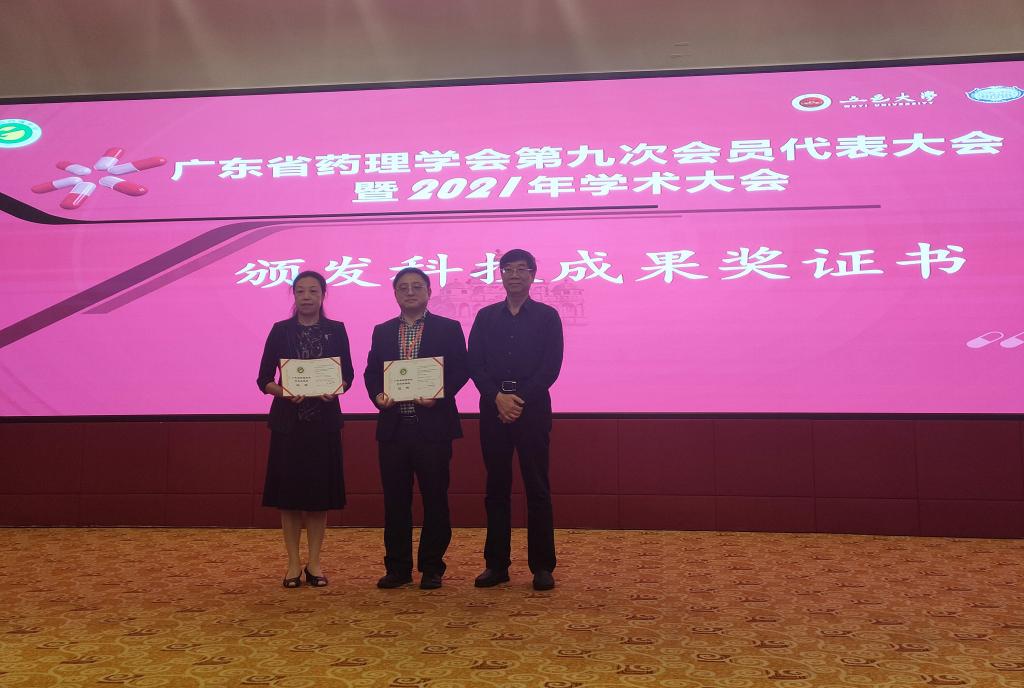 广东省药理学会第九届会员代表大会暨2021年学术大会10月22日-24日在广东江门召开,新葡萄药学院崔燎、徐道华、杨亚军、刘衍志、许碧莲、刘钰瑜、罗世英和广东省人民医院风湿免疫科崔阳共同完成的《丹参多酚类成分多靶标防治骨质疏松症的应用基础研究》获广东省药理学会科技成果奖二等奖。崔燎教授团队长期开展骨药理学相关研究,建立了多种骨质疏松症模型,开展中药和天然药物活性成分对骨与关节退行性疾病的药效学与机制研究。该研究成果证明了丹参及其水溶性成分多酚类化合物(丹参素和丹参酚B)的抗骨质疏松药效作用,并阐明其多靶点多环节调节骨代谢细胞信号通路的作用机制。研究成果为骨质疏松症、特别是疾病相关骨代谢异常难题提供了新的治疗策略,为推广应用心血管药物中药丹参及其制剂的新用途提供实验和理论依据。