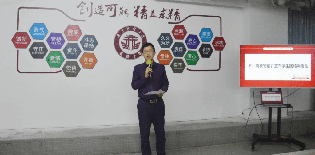 学生团开训仪式上,梁志勇副院长宣读求精书院学生团任命书,并由丁喜生院长、陈明副院长、李哲副院长分别为学院对接专班成员和学生团干部颁发聘书、工作手册。