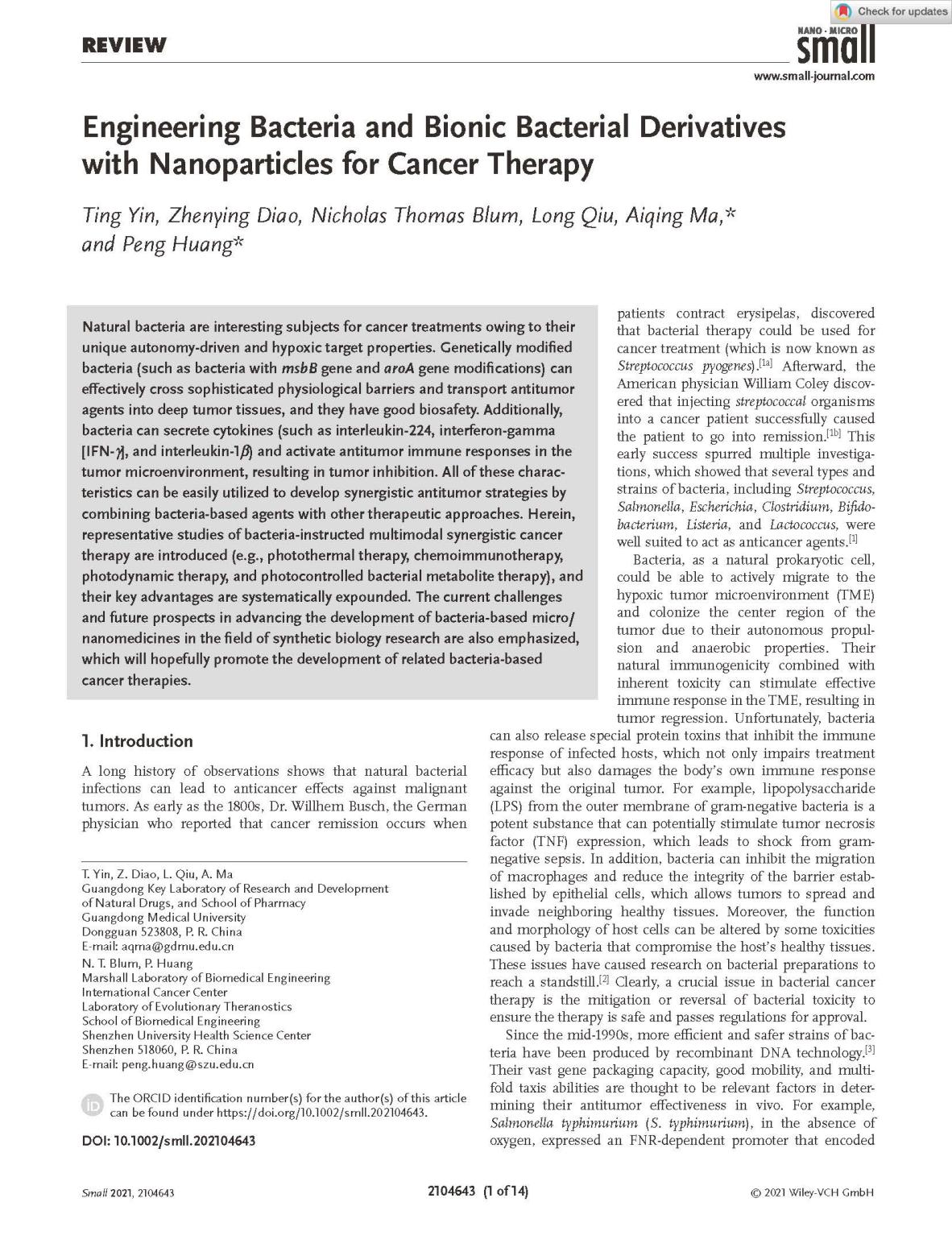 近日,药学院尹婷博士、马爱青博士和深圳大学医学部生物医学工程学院黄鹏教授合作,以新葡萄8883官网为第一单位在国际知名期刊《small》(2021年影响因子13.281)上发表综述论文《Engineering Bacteria and Bionic Bacterial Derivatives with Nanoparticles for Cancer Therapy》。全文由马爱青博士和黄鹏教授合作共同担任通讯作者,由新葡萄引进的高层次人才尹婷博士和药学院2019级本科生刁震英担任共同第一作者。