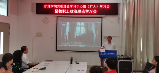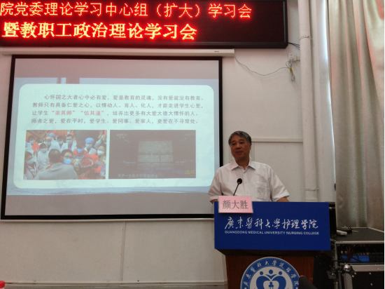 为全面贯彻习近平总书记关于教育的重要论述,引导学院教师更好理解育人大先生的丰富内涵以及如何争当新时代育人大先生。6月23日下午,护理学院在党员活动室召开党委理论学习中心组学习会暨教职工政治理论学习,会议邀请学校关心下一代工作委员会颜大胜副主任作了题为“争当新时代育人大先生”的主题报告。会议由学院党委副书记许崇泰主持,学院全体教职工及毕业生学生党员代表到场参会。