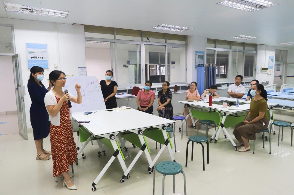 接着,所有参会教师分成几个团队,以工作坊形式围绕“理论课课堂教学使用什么教学方法,能提高学生学习效率”和“理论课与实践课教学如何整合,才能发挥最大的协同价值,提高学生综合能力” 两个议题进行分组讨论。蔡静怡老师认为理论课要改变传统单纯讲授方法,积极使用“雨课堂”“学习通”教学平台,实施“对分课堂、任务型TBL”等教学方法。谢朝阳老师认为理论课要多进行CBL病例教学。马万瑞和刘婷婷两位博士认为诊断学实践课要进行sp(模拟病人)情景模拟教学,最真实模拟临床才能得到更好的教学效果。附属东莞第一医院王导医生表示,学校丰富多样的课堂教学方法、教学手段让其受益匪浅,会好好学习消化。