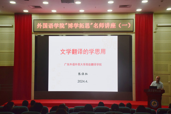 4月24日晚,广东外语外贸大学高级翻译学院张保红教授来到东莞校区行政楼1楼报告厅为外国语学院师生奉上一场精彩的学术讲座,讲座主题为《文学翻译学思用》。外国语学院院长杨劲松教授主持本次讲座。