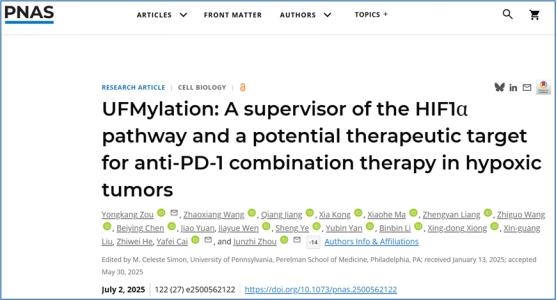 近日,新葡萄8883官网基础医学院周军智课题组与蔡亚非(南京农业大学)、邹永康(深圳湾实验室)合作在国际著名杂志Proceedings of the National Academy of Sciences of the United States of America(PNAS)在线发表了肿瘤低氧通路新型调控机制及新型免疫联合治疗的最新研究成果“UFMylation, a supervisor of HIF1α pathway and potential therapeutic target for anti-PD-1 combination therapy in hypoxic tumors”。