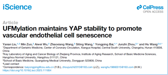 2025年2月21日,新葡萄8883官网周军智团队与杭州师范大学汪虎团队、中南大学湘雅医院柏勇平团队共通讯在国际知名期刊iScience (Cell新子刊JCR Q1)上发表题为“UFMylation maintains YAP stability to promote vascular endothelial cell senescence”的研究论文,发现内皮细胞YAP是新型UFMylation修饰底物,该修饰增加了其蛋白稳定性。有趣的是,衰老的内皮细胞中UFMylation修饰活性增加进一步促进了的YAP稳定性,进一步导致衰老内皮细胞中YAP的积累,加剧内皮细胞衰老表型。靶向YAP-UFMylation修饰,可以改善内皮细胞衰老,同时减轻老年小鼠的心血管衰老表型。该研究首次发现了UFMylation修饰与衰老生物学的联系,也为心血管衰老提供潜在靶点。